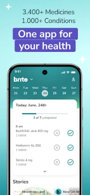 brite Health er utviklet med innsikt fra både pasienter og medisinske eksperter fra ledende europeiske forskningsinstitusjoner som Charité Berlin, og garanterer nøyaktighet og trygghet. Spor hvordan over 1000 symptomer utvikler seg, og se hvordan medisiner og livsstilsendringer påvirker din tilstand over tid med en intuitiv symptomdagbok. Administrer over 100 000 behandlinger og tilskudd med tilpassede påminnelser, og overvåk etterlevelsen din. En innebygd funksjon sjekker også interaksjoner mellom over 3400 medisiner og gir deg innsikt i mer enn én million rapporterte bivirkninger. Du kan være trygg på at brite er 100 % gratis, GDPR-kompatibel og utelukkende fokusert på din helse.