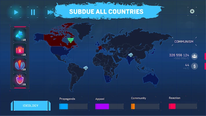 Din reise begynner med et strategisk valg av utgangsland – et fundament for din globale ambisjon. Fra dette punktet vil du utøve en usynlig makt, en idé som penetrerer sinn og omformer nasjoner. Ideology Rush byr på åtte unike fiktive politiske ideologier, som Kommunisme, Kapitalisme, Anarki og Økologisme, hver med sine særegne utviklingstrekk og ekspansjonsmetoder. Hver vei du velger, åpner for distinkte strategier og utfordringer, og dikterer hvordan du sprer din tro og bygger ditt imperium.