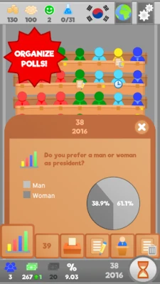 Når du først er valgt, begynner den virkelige strategien. Delta i avgjørende avstemninger for å vedta eller forkaste nye lover som vil forme samfunnet ditt. Det er ikke bare nok å vinne – du må også pleie dine egne lovgivere; utvikle deres erfaring, sikre deres popularitet blant velgerne, og opprettholde urokkelig lojalitet til partiet ditt. Naviger i et landskap fullt av rivaliserende fraksjoner, smi strategiske allianser, og kanskje til og med bruke mindre konvensjonelle metoder for å sikre flertall, alt mens du arbeider mot det endelige målet: å velge din egen president.