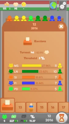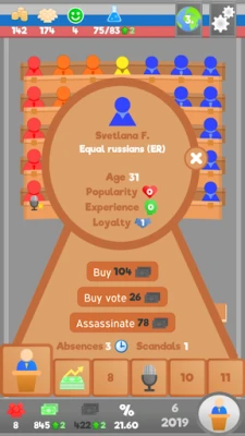 Når du vel har sikret deg din posisjon, venter et dynamisk parlament der du må navigere komplekse avstemninger. Godkjenn nye lovforslag som kan transformere samfunnet, eller opphev foreldede regler for å modernisere nasjonen. Men politikk handler ikke bare om lover; det handler også om mennesker og allianser. Bygg strategiske forhold med rivaliserende partier, inngå avtaler, og engasjer deg i den prestisjetunge kampen om å velge landets president. Samtidig må du pleie dine egne lovgiveres karrierer, forbedre deres erfaring, styrke deres popularitet blant velgerne, og sikre deres urokkelige lojalitet til din sak.