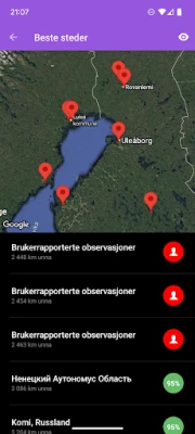 Med et øyekast får du tilgang til gjeldende KP-indeks og sannsynligheten for å se nordlys akkurat der du befinner deg. Utforsk vår kuraterte liste over de mest lovende observasjonsstedene og naviger deg frem på et globalt kart som illustrerer auroraintensiteten basert på pålitelige SWPC-prognoser. For de spontane øyeblikkene sørger gratis push-varsler for at du aldri går glipp av når geomagnetisk aktivitet forventes å stige, og gir deg den optimale timingen for å løfte blikket mot himmelen.