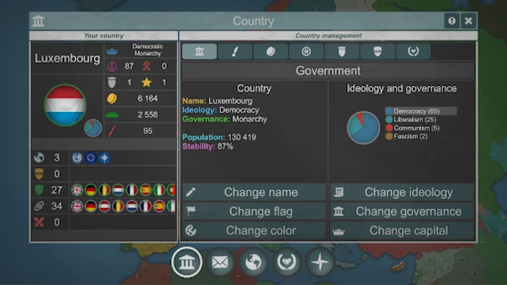 Dykk ned i et omfattende system som simulerer alt fra den skjøre balansen i globale allianser til fremskritt innen teknologi. Utforsk et dyptgående teknologitre som låser opp nye innovasjoner, fra landbaserte tropper og bygninger til banebrytende luftfart og missiler. Velg din ideologi, form din regjering, og utvid ditt rike gjennom strategisk kolonisering, alt mens du setter sammen en formidabel hær med varierte troppetyper og en infrastruktur som kan støtte dine ambisjoner. Hver beslutning du tar, vil ha vidtrekkende konsekvenser i din jakt på verdensherredømme.