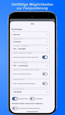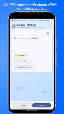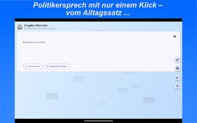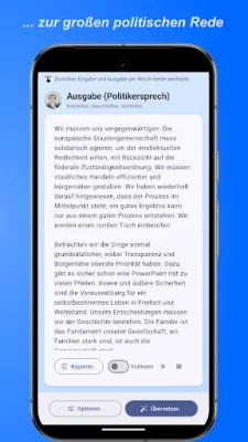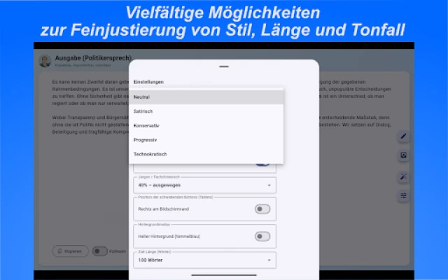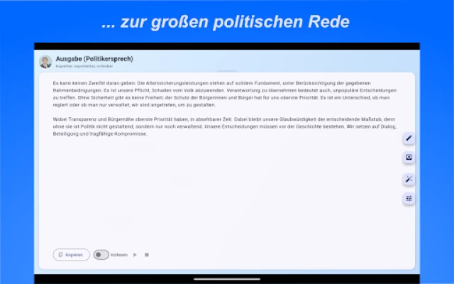 Politikomat gjør prosessen utrolig enkel. Du legger inn ønsket tekst – en hverdagslig setning eller et lengre avsnitt – og på et øyeblikk analyserer Politikomat budskapets kjerne for å deretter presentere en ferdigformulert politisk tale. Appen tilbyr enestående tilpasningsmuligheter: velg mellom skrivestiler som nøytral, konservativ, progressiv, teknokratisk eller satirisk. Juster talens lengde, fra antall avsnitt til et spesifikt ordmål, og finjuster nivået av sjargong, fagspråk og politiske floskler ved hjelp av intuitive glidebrytere. Politikomat identifiserer også automatisk sentrale temaer som klima, samferdsel eller sosiale spørsmål, og inkluderer en valgfri språkjustering for å sikre en plettfri levering. Deretter kan du enkelt kopiere, dele, eksportere eller lytte til din nye "tale" med den innebygde opplesningsfunksjonen.