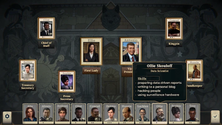 Administrer din godkjenningsrating, kontantbeholdning og ditt personlige "mannskap" med en kynisme ingen tidligere leder har våget. Ansett et skyggeteam bestående av leiemordere, hackere, lobbyister og andre spesialister. Send dem ut på farlige oppdrag, enten med lovlige midler eller, om nødvendig, med metoder som utfordrer lovens grenser. www.handy-games.com GmbH presenterer en engasjerende interaktiv fortelling hvor dine valg former skjebnen. Vil du avslutte perioden på dine egne premisser, eller er du bare en brikke i et større spill? Støttede språk: EN/RU.