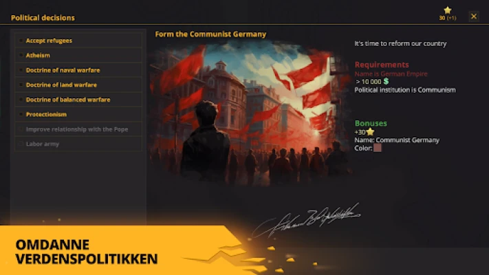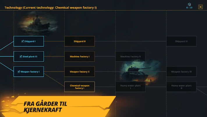 Når diplomatiet svikter, er det på tide å slippe løs militær overlegenhet i Warnament. Bygg en ustoppelig hær fra grunnleggende infanteri til ødeleggende atomvåpen. Dominer havene med en fryktinngytende flåte av kryssere, slagskip og hangarskip, og forsvar dine grenser med et nettverk av ugjennomtrengelige festninger og avansert infrastruktur. Velg å ignorere krigens etiske rammer ved å utplassere kjemiske eller nukleære virkemidler for å knuse dine fiender fullstendig. Men sann makt kommer også fra fremgang: Led nasjonen din gjennom et omfattende teknologitre, lås opp et bredt spekter av banebrytende bygninger og strukturer. Form samfunnet ditt ved å velge blant et halvt dusin politiske regimer, og ta skjebnesvangre beslutninger som vil diktere historiens gang. Forvaltningsdyktighet er avgjørende; kontroller hver enkelt provins uavhengig for å maksimere økonomisk vekst og vitenskapelig innovasjon, og sikre din langvarige suksess.